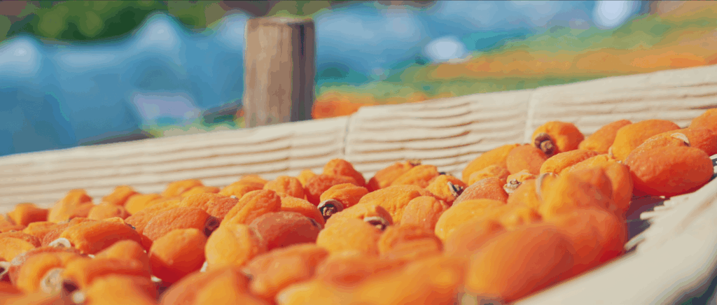 秋から冬にかけて軒先にずらりと吊るされる柿。周囲の木々はだんだんと色褪せ冬支度を始める中で柿だけは煌々と鮮やかな色を保ちつつ、柔らかな晩秋の陽の光に照らされて少しずつ水分が抜けていきます。これは日本の干し柿作りの風景であり、柿の産地では冬の保存食として干し柿作りが行われてきました。乾燥して一回りも二回りも小さくなった柿の表皮についた白い粉は、柿渋タンニンが乾燥することで糖化したもの。中を割るとオレンジ色の実が顔を出します。日本で古くから愛されてきた干し柿は、噛めば噛むほど甘いのです。先人たちの知恵によって作られたこのドライフルーツは、8世紀には日本の文献に登場しており、「柿が赤くなると医者が青くなる」といわれるほど栄養価に優れており、保存食として冬の寒さが厳しい地域で生産が盛んになったのもうなずけます。