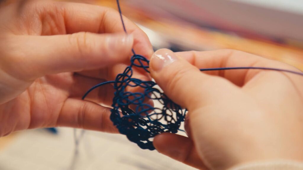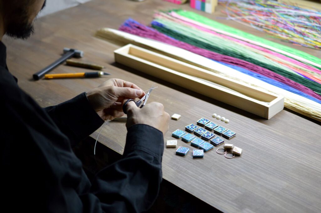さらに時代が下ると、水引には様々なバリエーションが生まれますが、変わらないのは水引に添えられる送り手の気持ちでしょう。例えば、蝶結びの水引は、繰り返し結んで開けるという意味で出産や進学など、何度あってもめでたい慶事に使われます。一方で、解けにくい結び切りの水引は、葬式や結婚式、病気や災害見舞いなど、繰り返すべきではない慶事や弔事に使われ、それが一度きりで済みますようにという願いが込めれています。水引の「結び」は、まさに送り手と受け手の心を繋ぐのです。飯田水引は現在では、アクセサリーや工芸品、アート作品としても評判を呼んでいる。例えば、金属や木などと組み合わされた RITUAL the crafts のアクセサリーは、紐の色の組み合わせによってバリエーションがあり、メンテナンスをすれば、長く使うことができます。鮮やかな飯田水引の花瓶は、自然の草花の色合いとも相性がいいです。また、色も豊富で長さも自在に変えることができる飯田水引は平面・立体問わず、様々なアート作品への活用が可能。和紙から作られる一本の糸は、形や色をしなやかに変え、私たちの生活に彩りを添えてくれるのです。