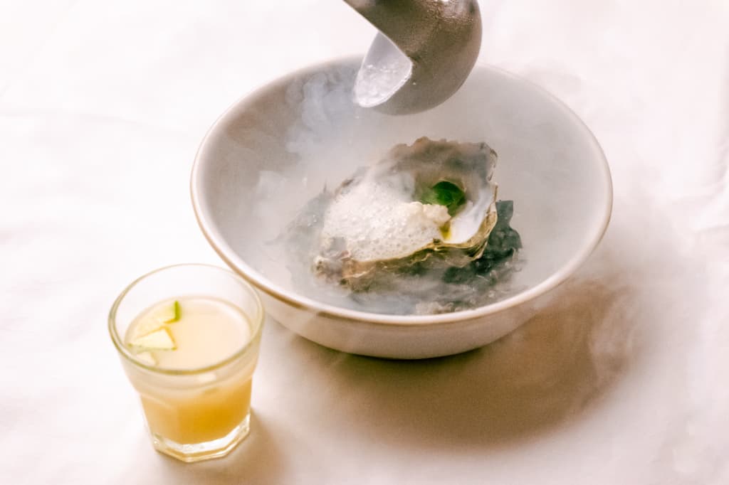 ライチ果汁の優しい甘さを長野県産寒天で固め、牡蠣の持つヨード香ミネラルを合わせた。
