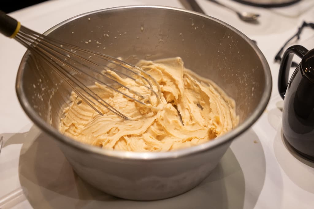 初めにアイスクリームの素となる卵クリーム液を作って置き、そこに長野県産白味噌(口当たりの良さの為、滑らかに濾してある味噌が良い)を溶かして置く。液体窒素を少しずつ入れ、泡立て器で撹拌した “出来立て白味噌アイスクリーム” 。