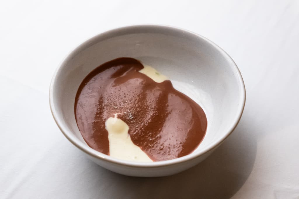 ホタテのポワレの香ばしさと味噌の持つコク、旨味を焼いた事によって生じるアミノ酸の旨味と味噌の香ばしさ(キャラメル香)と、コーヒーの香ばしさ、軽やかな苦味と合わせた。