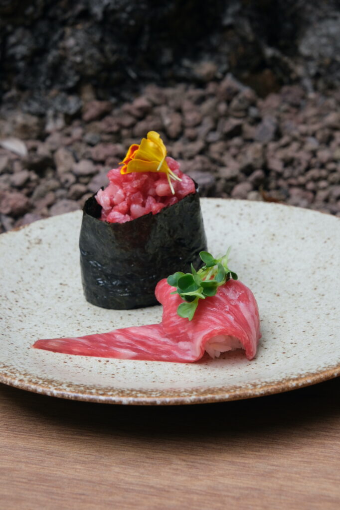 ディナーコースは、凍り豆腐のイタリア野菜添えや爽やかな長野県産わさびを使った鶏わさから始まり、信州牛の軍艦、緑色が美しい抹茶そばと続き、メインには信州牛のサーロインステーキ、デザートには長野県生まれの黄色いりんご「yello®」(和名:シナノゴールド)をたっぷり使った一口寒天が提供されました。