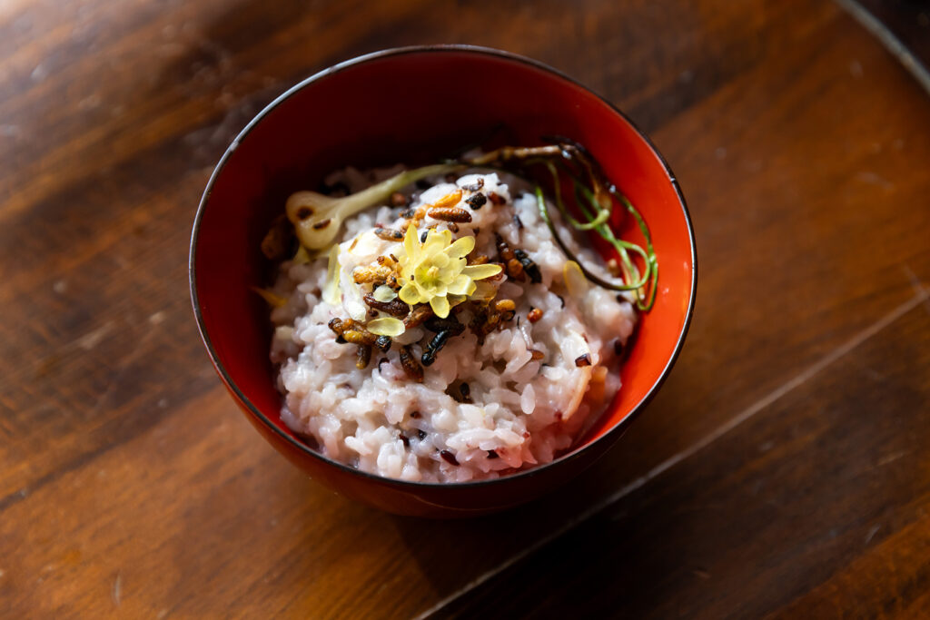 地域で採れた野草や野菜を使った健康的なものになります。驚かれる方も多いのですが、野草は根を付けたままお出ししたり、長野県の珍味である蜂の子入りのご飯には、素揚げした成虫も入っていたり、土を焼いてスープに仕立てたり。味付けも最低限の味噌や塩などで仕上げているので、素材の持つ個性がより際立ちます。 代々受け継がれた土地のエネルギーをまるごと感じていただけたらと思っています。